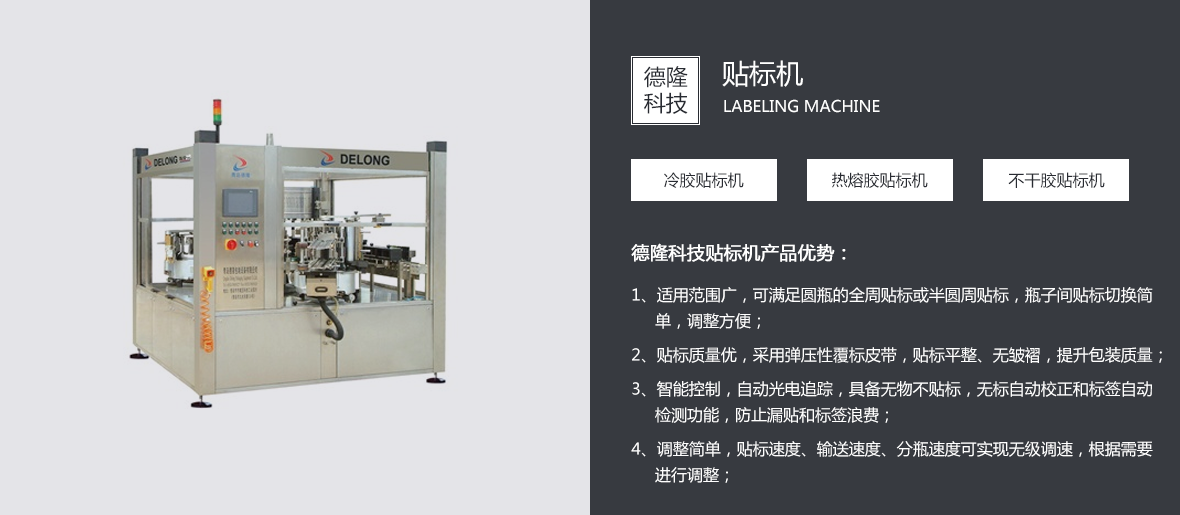 青島德隆自1995年創(chuàng)建以來,始終秉承創(chuàng)新與發(fā)展的優(yōu)良傳統(tǒng),依靠技術(shù)與服務(wù)贏得客戶的信賴與尊重。在貼標機向?qū)W⒒⒍嘈袠I(yè)領(lǐng)域發(fā)展并成就了中國異型瓶貼標市場的經(jīng)典之后,應市場不斷變化的客戶需求,優(yōu)化產(chǎn)品結(jié)構(gòu),引進吸收國內(nèi)外的流體包裝設(shè)備理念,在貼標機專業(yè)化地位穩(wěn)固的前提下,逐步實現(xiàn)關(guān)聯(lián)產(chǎn)品的多元化。   目前,青島德隆已經(jīng)成為國內(nèi)能同時滿足圓瓶、方瓶、扁瓶、錐度瓶、球形瓶、定位瓶等瓶型的高、中、低速多功能冷(熱)膠貼標領(lǐng)域的廠家。隨著碼/卸(瓶/罐)垛機、沖瓶機、灌裝擠(旋/壓)蓋機、全自動紙箱包箱設(shè)備、排序機、機器人碼/卸垛設(shè)備、激光噴碼機的運行成功,一個真正的流體包裝設(shè)備方案解決專家已經(jīng)成熟。   青島德隆集團的···......[查看詳情]